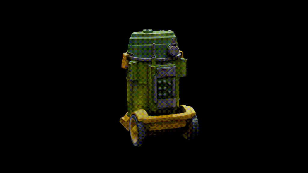 Prop Master, Nathan Weidman, turned the humble hot-tub bot into a sweeper droid. He was then scanned into Blender and animated, so that he could live out his dream with all the other robots on the Ark.